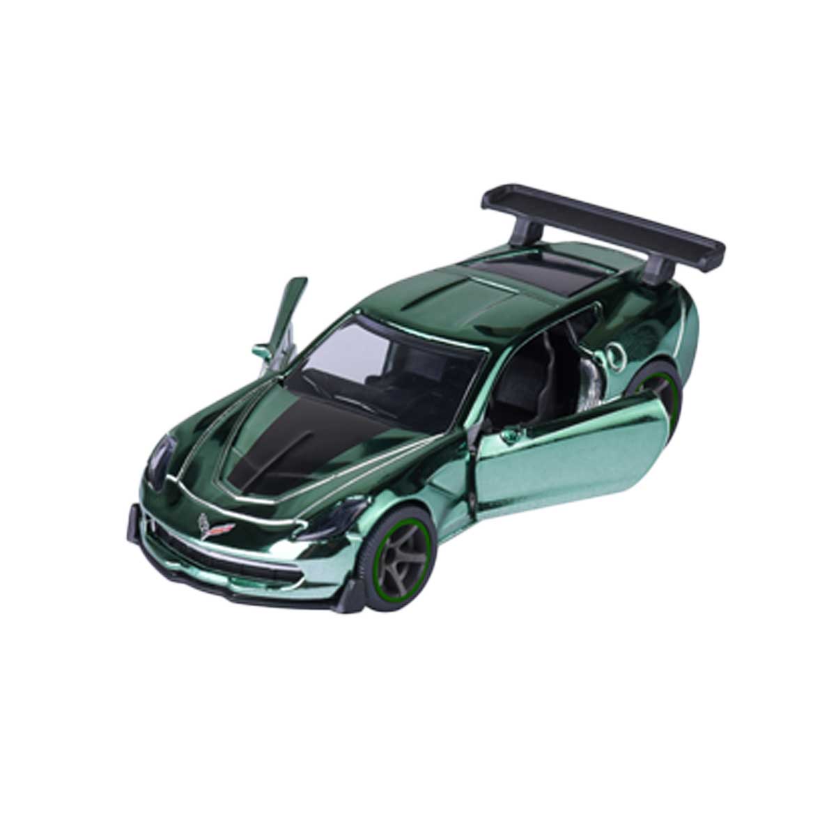 Sportliche Corvette in Metallic-Grün mit beweglicher Tür, Freilauf, Federung und Gummireifen. Offiziell lizenziert, aus Metall gefertigt und inklusive Showroom-Sammelbox. Perfekt für Sammler & Kinder ab 3 Jahren.