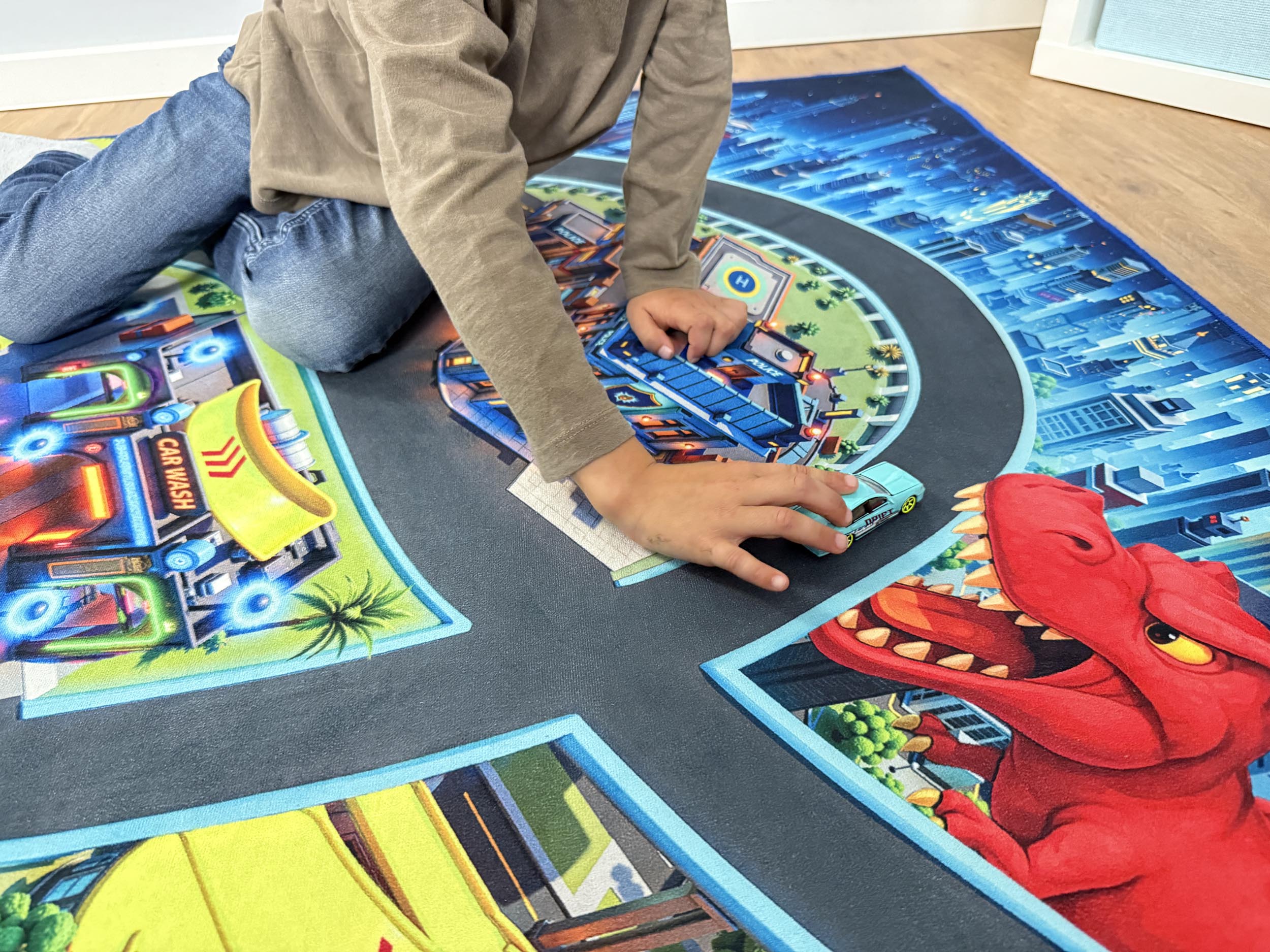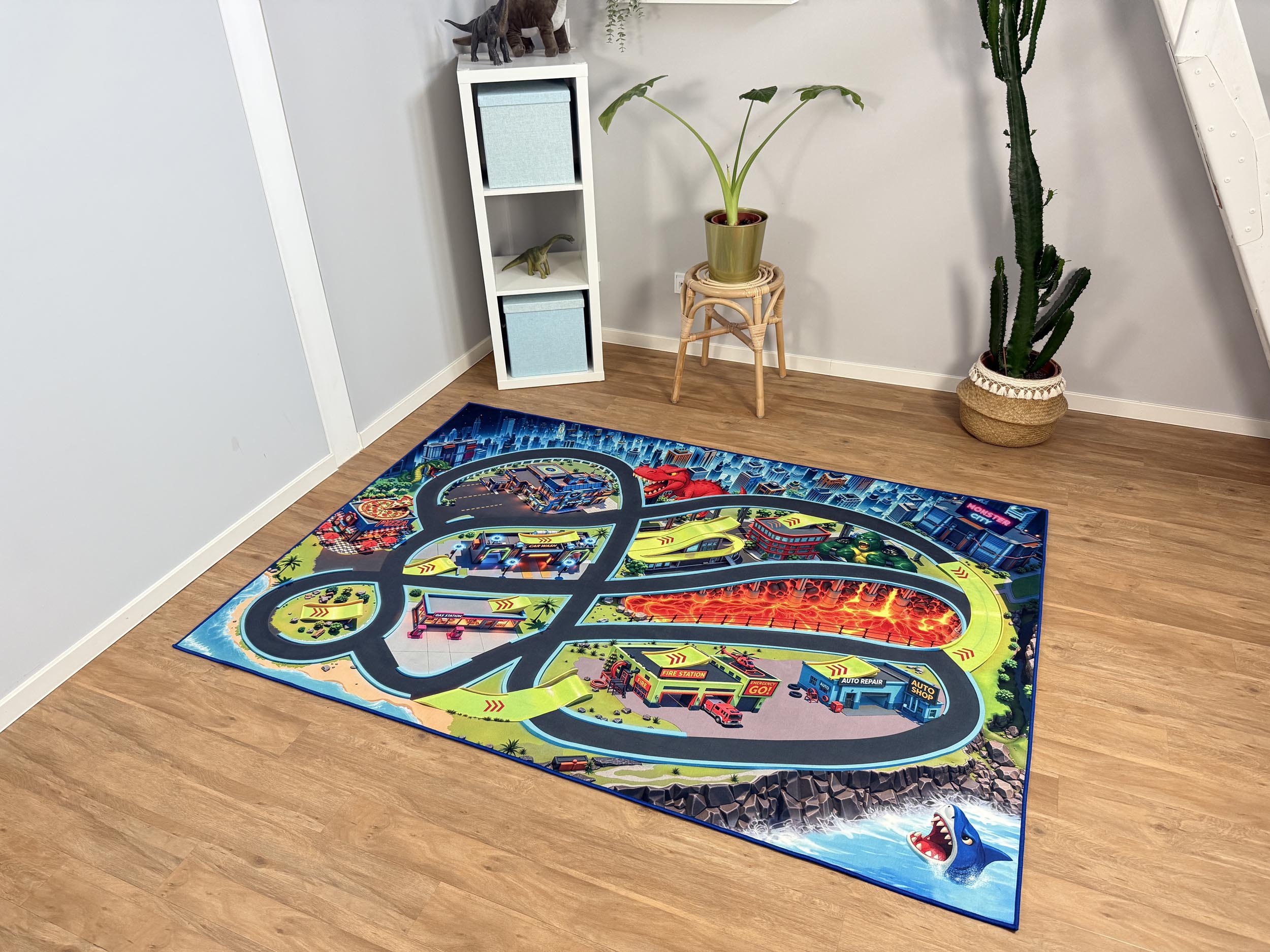 Ob alleine oder gemeinsam mit Freunden, Geschwistern oder Eltern – auf diesem Teppich wird jedes Spielauto zum Heldenfahrzeug. Kinder können Rennen austragen, Ungeheuer bekämpfen oder ihre Stadt vor Monsterangriffen retten. Die geschwungenen Straßen und Rampen bieten ideale Bedingungen für kreative Rollenspiele und fantasievolle Abenteuer.